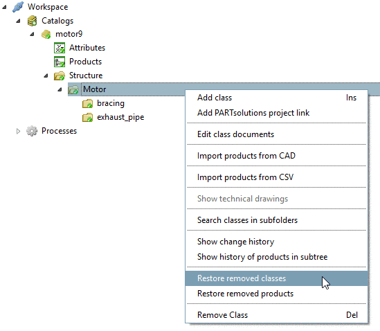 Initial situation: Below the class "motor" the subclass "spacer" has been removed via Remove Class. Afterwards the change had been committed.