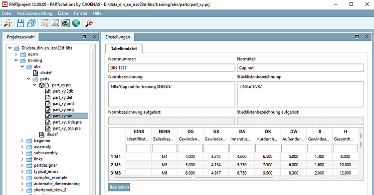 -> In PARTproject the characteristic attribute table of the cap nut is transferred as "part_xy.tac". Clicking the button again will now immediately open the newly created table.