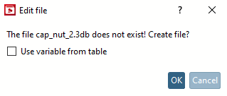 Because of the chosen Template, blank files for Geometry (cap_nut_2.3db) and Table (cap_nut_2.tab) are already available. Both files still have to be given some content.