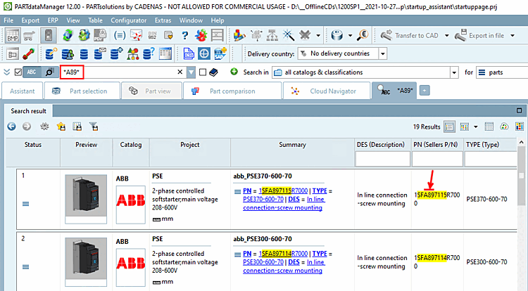 A wildcard search is always associated with a certain loss of performance, but it depends on how many hits there are. For example, a search for s* is significantly slower than a search for *screw. If a search for s* is carried out across a large number of catalogs, it can happen that the PARTapplicationServer aborts the search because it would cost too much performance. In this case, an error message such as: Placeholder search too general. [Wildcard search too general. Narrow down the search by specifying additional letters or numbers.] Restrict the search further by entering additional letters or numbers. [Wildcard search too general. Narrow down the search by specifying additional letters or numbers.]