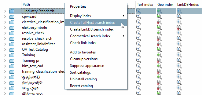 At the top level (catalogs ), the full-text search index can be generated completely new for all catalogs (Create all catalog search indexes [Create all catalog search indexes] ) or only added for non-existent catalog indexes (Create non-existent catalog search indexes [Create not existing catalog search indexes] ).