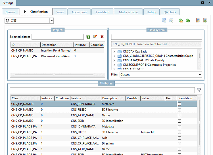 CNS: CADENAS classification used e.g. for CAD integration (placement information, connection point classification and attributes) or order number, type code, certificate information. For details see Section 5.12.3.1, “Classification (CNS) ”.