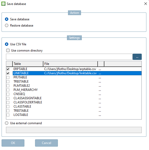 If you activate the checkbox under Use shared directory [Use common directory], all tables are saved with their default name in the selected directory.