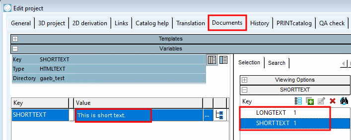 5. Switch to the Documents tab page, create the two media variables here too and enter the texts.