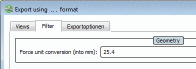 In the Export using ... format dialog box at the export of 2D formats the Filter tabbed page is displayed with the input field Force unit conversion (into mm). So you can optionally perform an inch-mm conversion during the export.