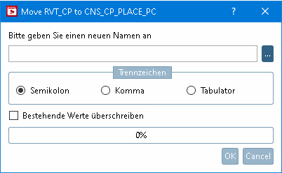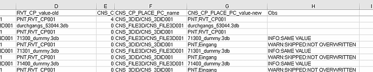 A: PRJ.File B: RVT_CP_instance – Instanz des alten RVT_CP C: RVT_CP_name – Name des alten RVT_CP D: RVT_CP_value-old - Wert des alten RVT_CP E: CNS_CP_PLACE_PC_instance – Instanz des neuen CNS_CP_PLACE_PC F: CNS_CP_PLACE_PC_name – Name des neuen CNS_CP_PLACE_PC G: CNS_CP_PLACE_PC_value-new – Wert des neuen CNS_CP_PLACE_PC H: Kommentare