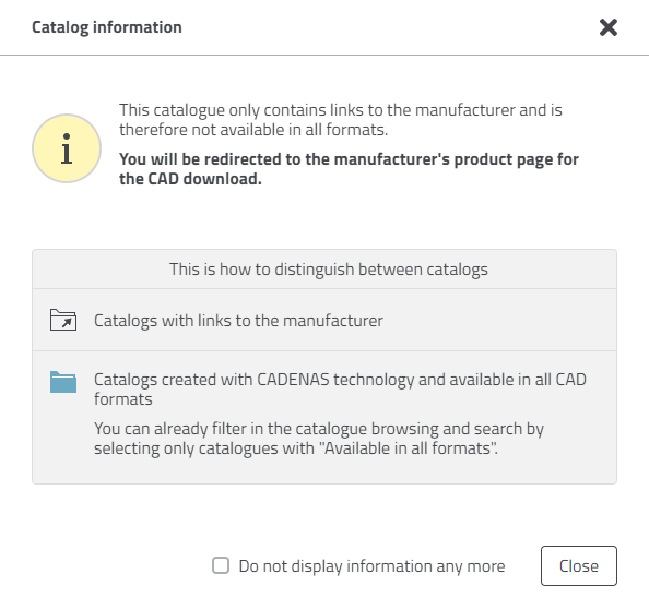Filter search across all catalogs also includes catalogs linked to the manufacturer, Available in all formats refers only to catalogs created with CADENAS technology. If ALL catalogs are displayed, you can distinguish them by the catalog icon.