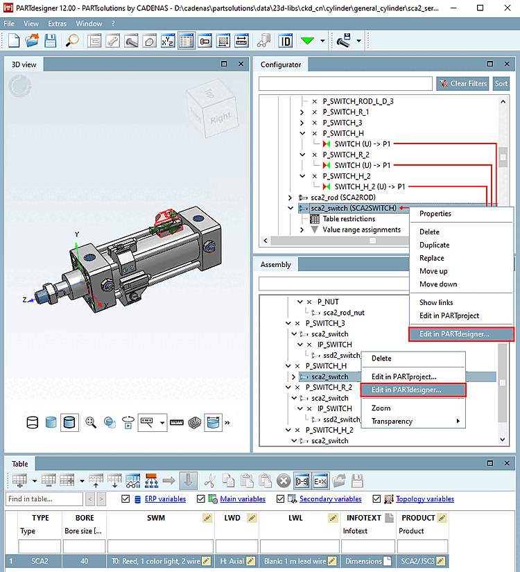 In V12, individual parts of the assembly can be edited [Edit in PARTdesigner...] using the context menu command Edit in PARTdesigner [Edit in PARTdesigner...]... in both the configurator [Configurator] and the assembly docking window [Assembly] in PARTdesigner can be opened for editing.