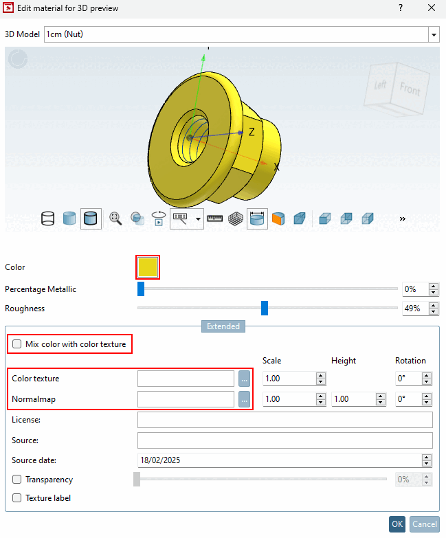 You can make the following settings in the Edit material for 3D preview dialog box:
