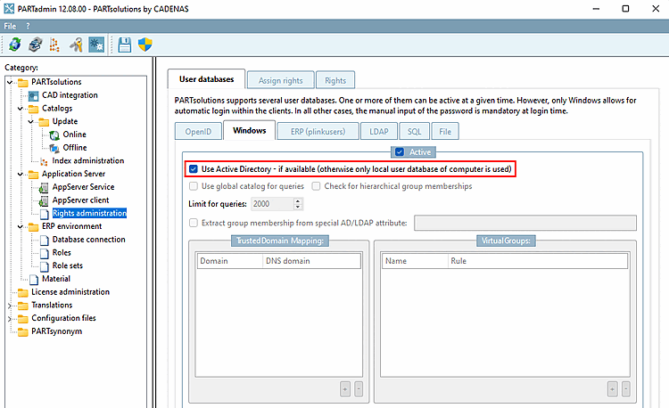 On the Windows tab page, you will find the option "Use Active Directory if available (otherwise only the local user database of the computer is used) [Use Active Directory - if available (otherwise only local user database of computer is used)] ", which allows you to deactivate AD searches. The local user database remains usable as the server may be running as a local user account.