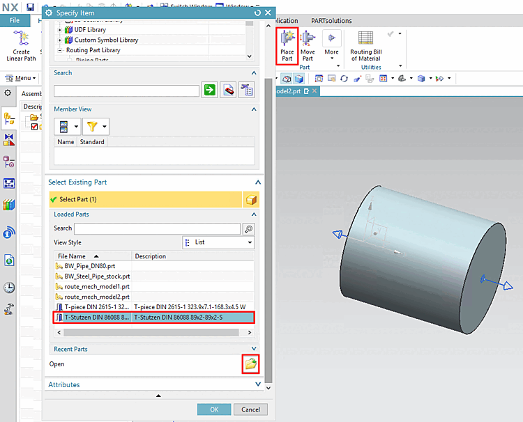 The following describes how to insert a PARTsolutions part using standard NX tools. In this example, the inserted part is connected to a manually created part (see Section 5.12.11.6.1, “Design parts in NX via path structure and "Stock" function”). (In placement dialog