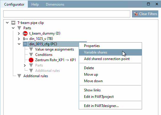 In the Configurator docking window, in the context menu of the "Pipe clamp (R)", click on the Variable releases [Variable shares] command.
