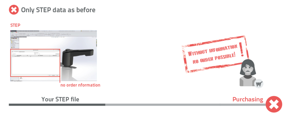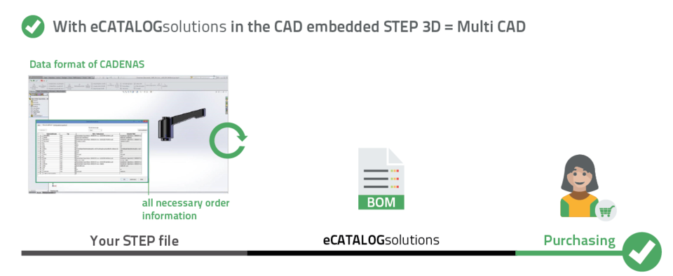eCATALOGsolutions enriches your 3D STEP models with any attributes and languages. These are added to the CAD geometry, whereby the BOM automatically contains all data important for procurement, without extra effort. Your order is almost certain with easily accessible manufacturer information and part number. The risk of unknowingly giving an order to a competitor is virtually eliminated.