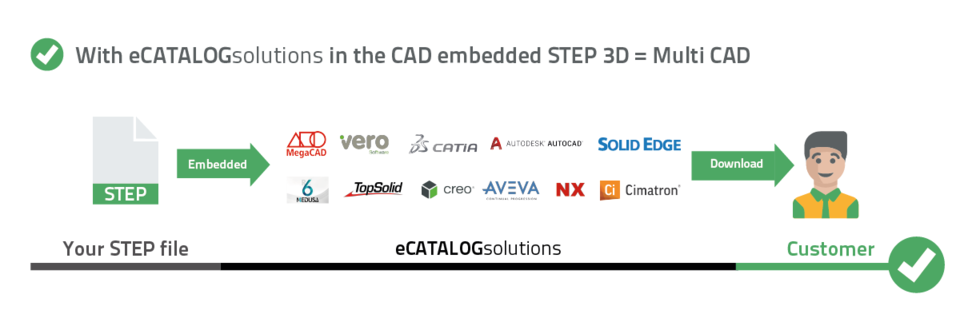 CAD data that has been enhanced with the CADENAS eCATALOGsolutions technology remain available as traditional STEP files. However, our technology makes it possible to convert these files into 120 different native formats, while at the same time enrich them with BOM and eProcurement information from your PIM system. Thus, customers and prospects can easily download and integrate your CAD data into their designs.