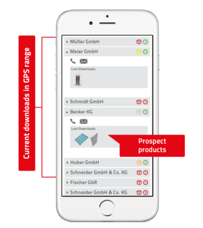 The sales representative only sees the download information of customers and prospects within his allocated sales region. Potential customers in the direct surroundings can be located in combination with aproved sales region and