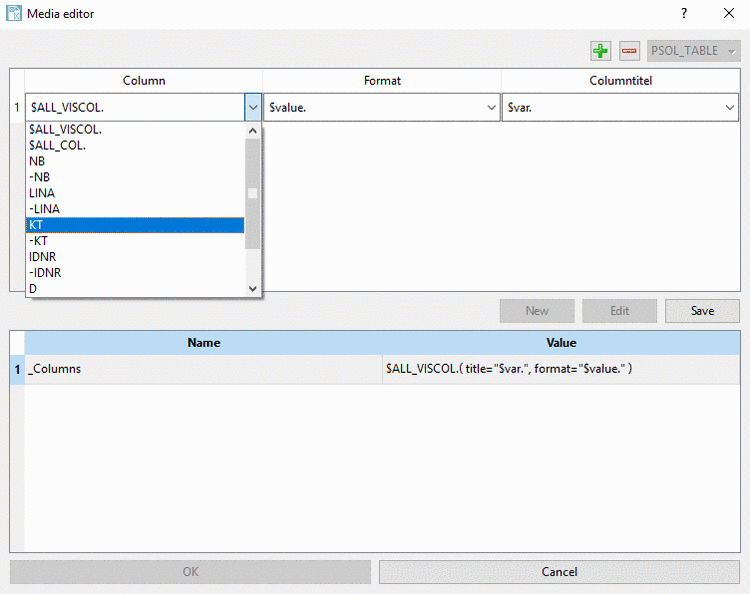 _Columnsand click on . If the variable does not exist yet, then create it as described under Section 10.6.1.1, “Create Media Variables”.-> The upper half of the dialog box is activated now (before it was grayed out) and the settings for Column (column display), Format (line formatting) and Title (title formatting) become visible.