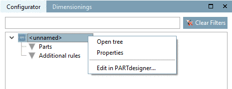 At the uppermost level (assembly) you can find the context menu commands Open tree, Properties and Edit in PARTdesigner....