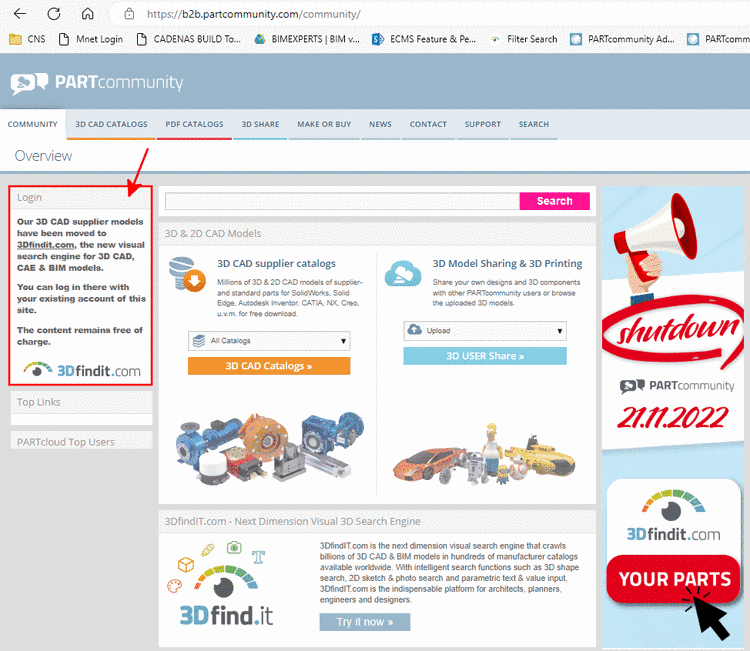 https://b2b.partcommunity.com/community has been shut down on the 21th of November 2022. Our 3D CAD supplier models have been moved to 3Dfindit, the new visual search engine for 3D CAD, CAE & BIM models. You can log in there with your existing account of this site. | |
