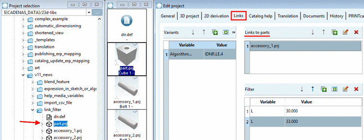 Parts entered in PARTproject -> Edit project -> tabbed page Links -> dialog area Links to parts, are displayed in PARTdataManager, in the docking window Links under list field option Accessories.