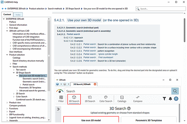 3Dfindit : appelez l’aide en ligne dans le système de CAO, dans le menu ENTERPRISE 3dfindit ou dans le