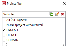 Example: You applied a catalog. It contains parts (projects), some of which are to be visible to everyone and some only for customers abroad. Then give certain projects the filter "english", others "french", etc.