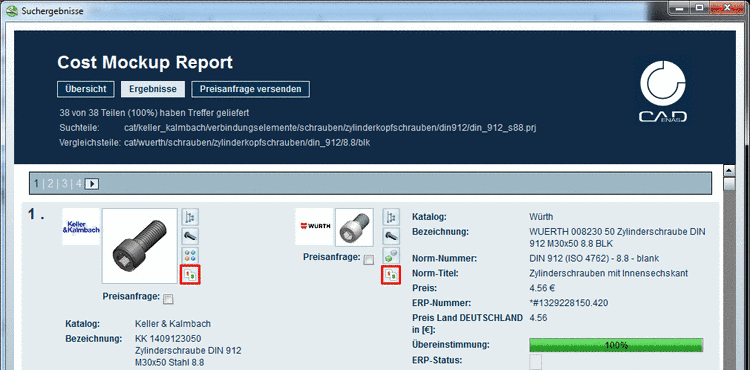 Under Results you can see a listing of all search parts. For each search part the respective found parts are assigned with additional pricing: