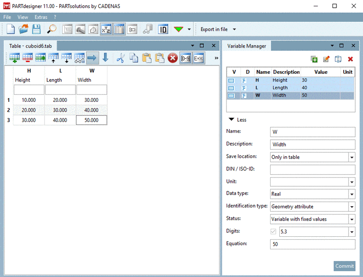 In the Variable Manager, create the variables L (Length), W (Width) and H (Height) for a cuboid. Details on the Variable Manager can be found under Section 7.8, “ Docking window "Variable Manager" ”.