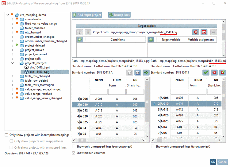 -> Once selecting a row in the left table, on the right, the correct target project is shown.
