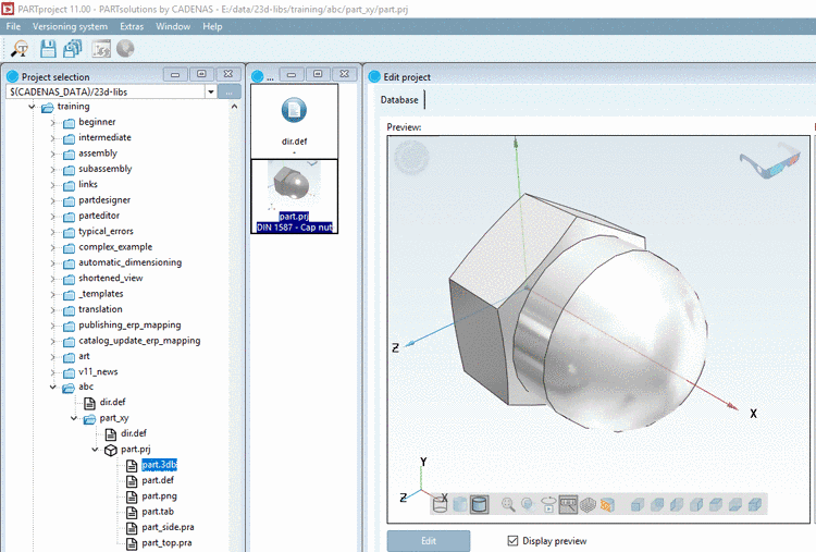 -> In PARTproject, now the geometry of the cap nut is taken as „einzelteil-projekt.3db“ ("single-part-project.3db"). The preview depicts the part.