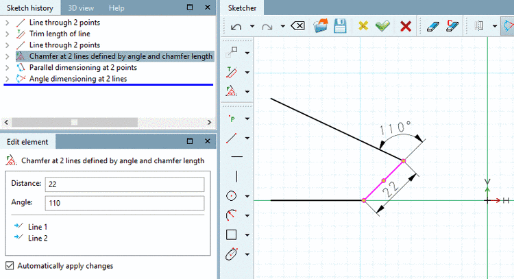 Chamfer between 2 lines, adjustable via angle on first selected line (counterclockwise) and length of chamfer.