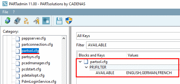 prjfilter.cfgis created in the catalog root directory with the list of filters. Alternatively also inpartsol.cfg, project filters can be created: Create the block PRJFILTER and the key AVAILABLE here and enter the desired filters separated by comma.Then in the dialog box (see Fig. „In this example only rows with filter "ENGLISH" are visible.“) these project filters are offered in all catalogs plus project filters from