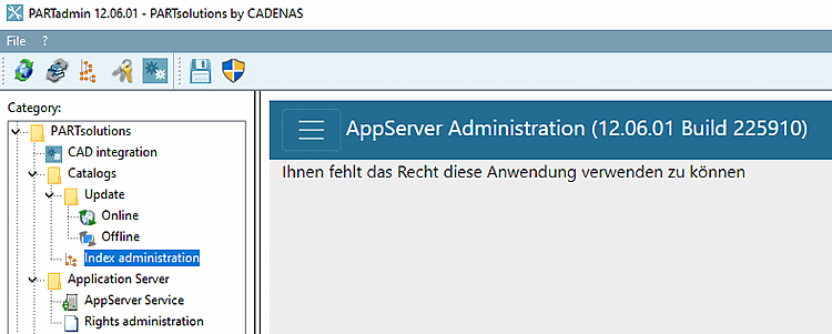Si vous n'avez pas le droit d'utiliser l'application, vérifiez-le côté serveur dans PARTadmin sous la catégorie Serveur d'applications > Administration des droits > page à onglet Attribuer des droits.