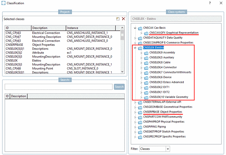 This chapter's focus is on using the CNS classification. That target systems additionally need to be classified according to eClass in order to identify the part type, remains untouched by this. Within the CNS classification, besides classifying with specific electrical classes (CNSELEK [part level] or CNS_CP|4 [connection points]) also classifying with classes for determining the graphical representation (CNSCAX|GFX) or object properties (CNSERPBASE [see Section 5.12.3.1, “Classification (CNS) ”]) matters, just to name a few.