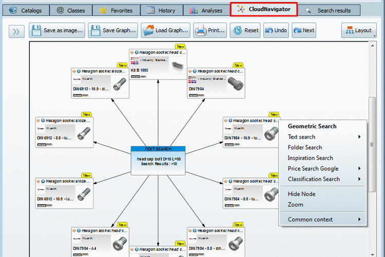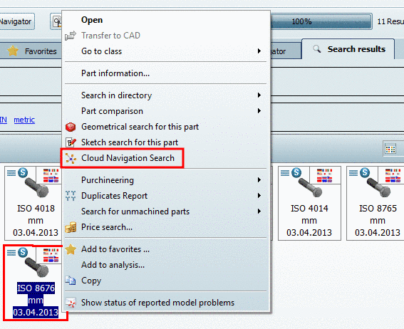 The result in the Cloud Navigator shows all found standard parts