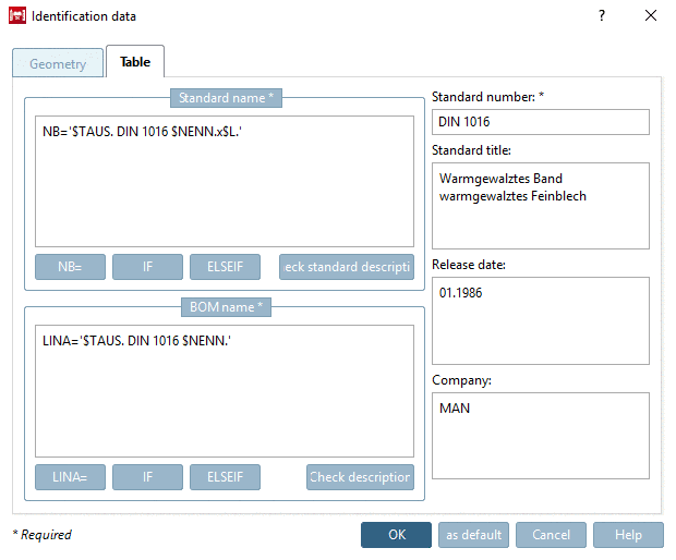 A newly created or changed table can only be saved and left, if Identification data have been given.