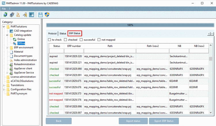 On the tabbed page ERP Status you can find a listing of all ERP numbers with their update status (not mapped, checked, successful and expired), furthermore Path, Path (new), NB and NB (new). Explanations on the individual status can be found above.
