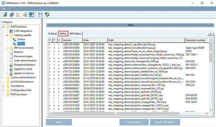 If there are no datasets with the note to check or not mapped the installations runs through without further note. Then, at the end of installation the tabs Protocol, Status and ERP Status are displayed again - this time in the standard dialog area under Catalog update -> Offline.