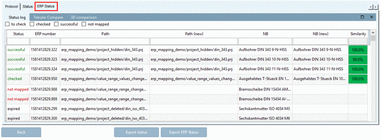 For all affected ERP numbers the status (checked, successful, expired and not mapped) is displayed, furthermore Path, Path (new), NB and NB (new).