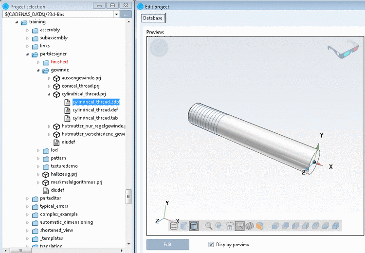 installed training catalog, an example can be found under $CADENAS/Training/PARTdesigner/Threads/cylindrical_thread.prj.