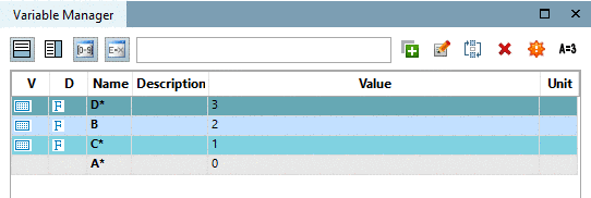 Function: In the docking window Variable Manager, you can create new variables or change attribute values of existing variables.