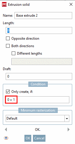 .Open Base extrude 2. The invalid condition "0=1" has been entered.