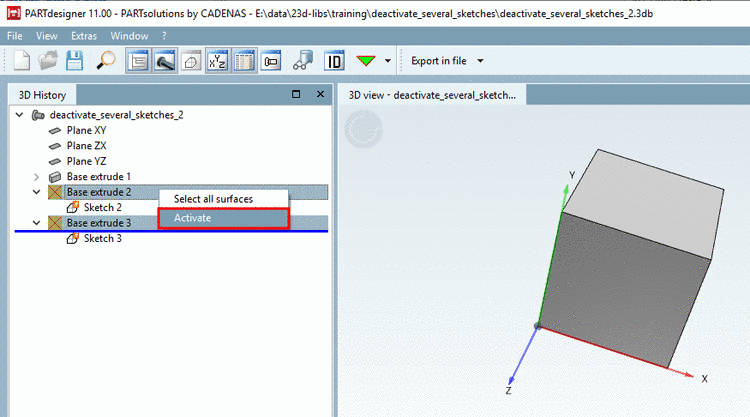 Sometimes it makes sense to temporarily disable one or several sketches (Base extrude / Cut extrude) (e.g. for testing purposes).