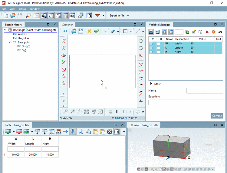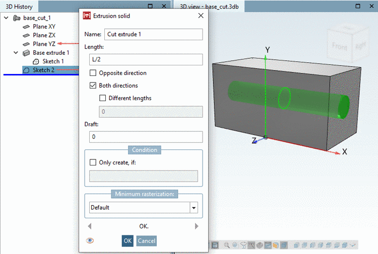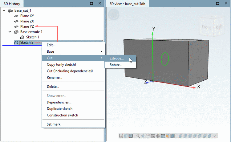 -> In the 3D History, another point (feature) shows up: Cut extrude 1.