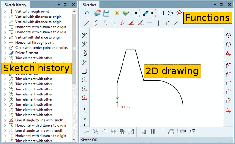 The docking window 3D History is a central "arena" within PARTdesigner. Via its context menus, the Sketcher (with Sketch history) is opened and the part created.