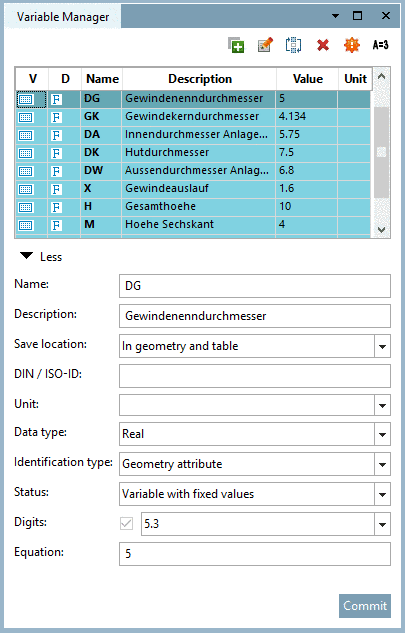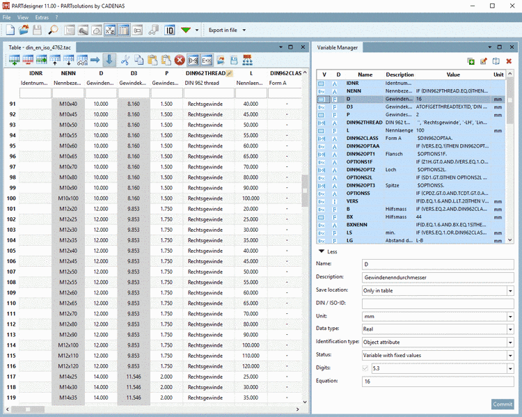 In PARTdesigner, instead of fixed dimensioning values, variables are created, which are filled by concrete values from the characteristic attribute table. This method has the advantage that a new sketch must not be made for each part value (characteristic).