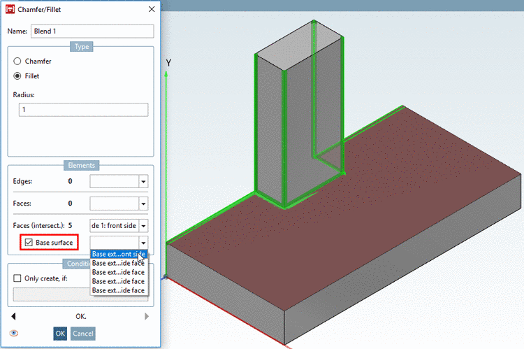 Only edges adjoining the base surface are rounded (or bevelled). The vertical edges at the small cuboid for example are not rounded in compare to the use without base surface (compare above).