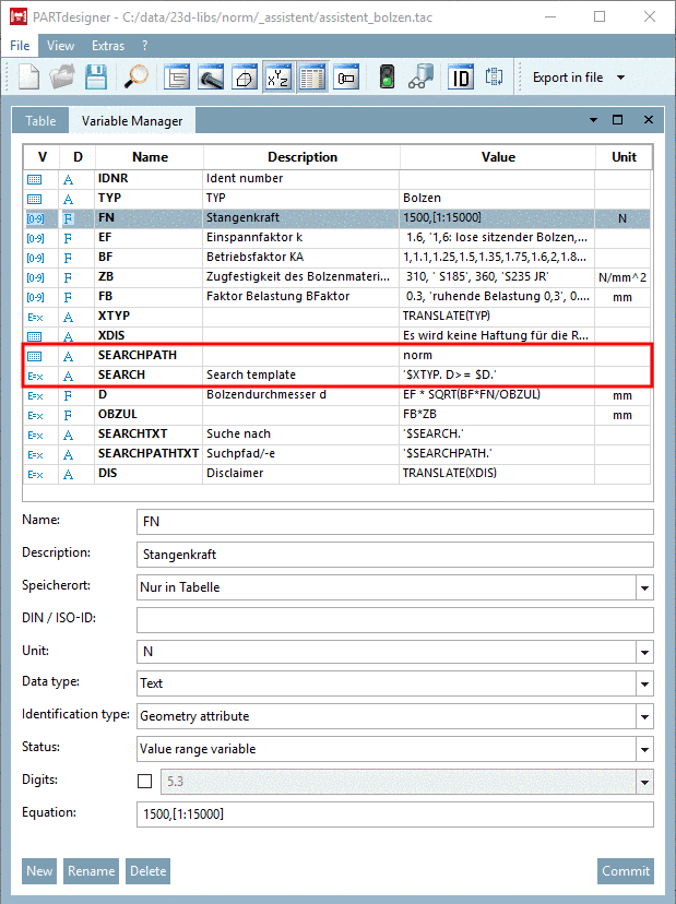 2. In PARTdesigner, in the Variable Manager, create the variables SEARCHPATH and SEARCH. This is mandatory.