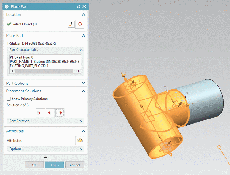 In the following is described how you can insert a PARTsolutions part with the NX standard procedure. Here in this example, the inserted part is connected with a manually created (see Section 5.12.14.6.1, “Design parts in NX via path structure and "Stock" function”).