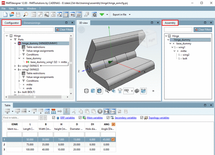 In the docking window Configurator, the set of rules is created, which builds up an assembly from single parts. Via context menus, Rules are specified for each connection point and Conditions for each part.