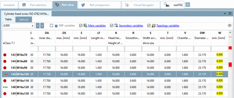 In the following it shall be explained how a search can directly deliver the desired characteristics, how these can be checked textually (table variables, topological and class attributes) and geometrically in the 3D view in the docking window Part comparison and how the desired part can be directly exported into the CAD system.